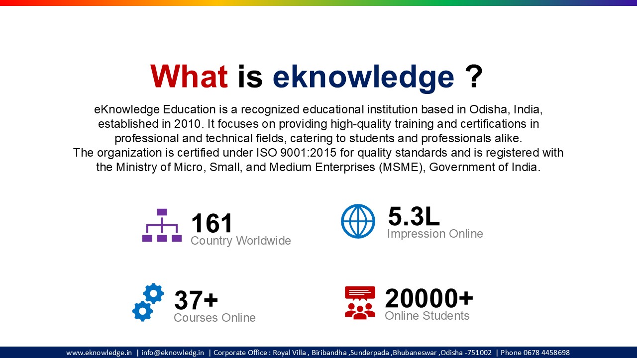 With more than 15 years of excellence in education and skill development, EKNOWLEDGE EDUCATION has successfully trained 20,000+ learners worldwide. We are a government-recognized non-profit organization committed to affordable, inclusive, and career-focused education. We are registered with NITI Aayog, Government of India, certified under 12A & 80G by the Income Tax Department, and registered with the Ministry of MSME. We are also recognized under StartUp India and IGR Odisha, ensuring transparency, trust, and credibility.
