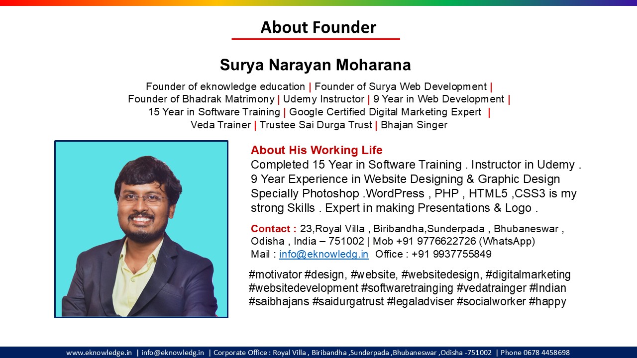 Duplex No .23 ,Royal Villa , Biribandha , Sunderpada ,Bhubaneswar , Odisha , India 751002 | Mail ID info@eknowledg.in |